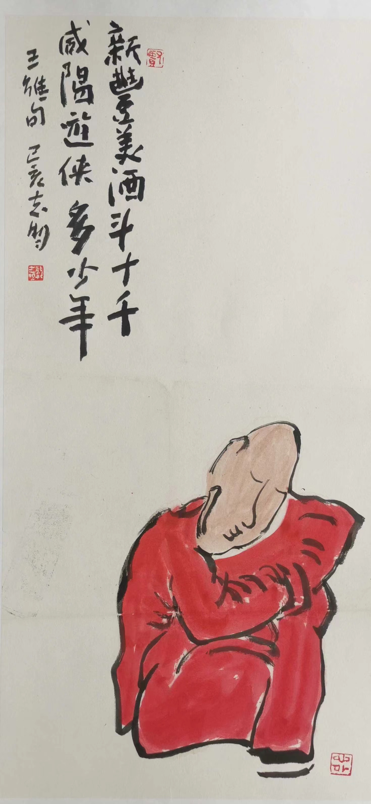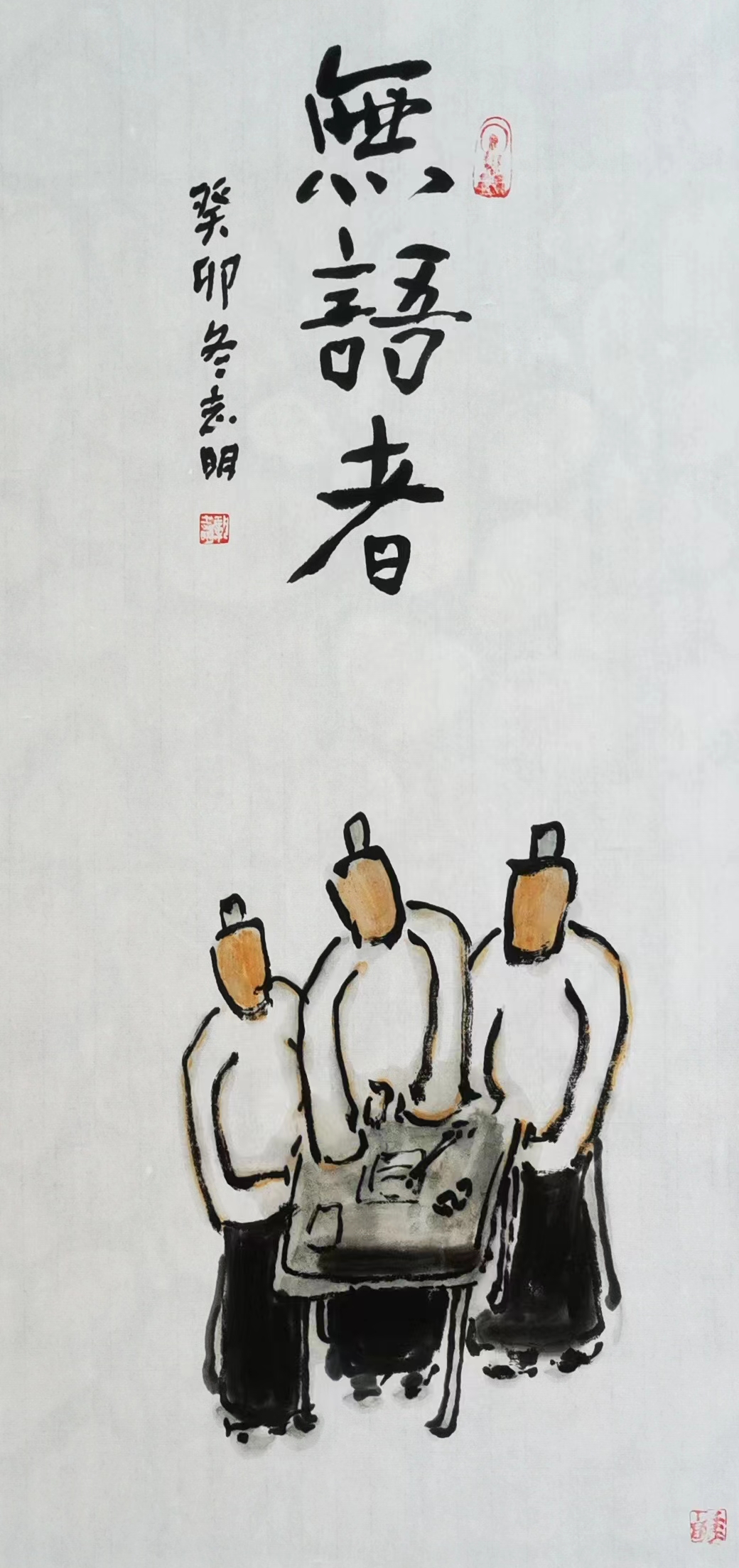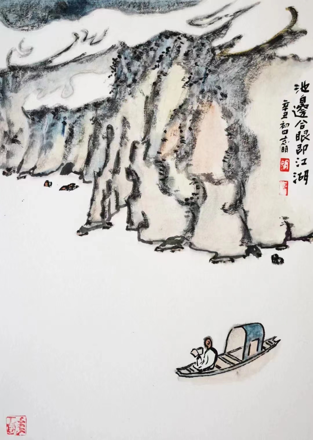 記得那一年的端午節(jié),鞏志明發(fā)來短信,是他寫的一首詩:綠粽黃酒聚江邊,白帆紅燭祭屈原。三千清淚流不得,九萬渾念飄上天。誰有郁悶誰散淡,何謂圓滑何忠奸。十丈風塵古今在,談笑真?zhèn)位聼煛?017年,我遷新居,鞏老師為我寄來小品畫《福到眼前》,我很喜歡,并懸掛至新居玄關。這些年,鞏志明老師常做影展畫展策劃及影評講座,自已也臨池不輟,水墨丹青,寄情抒懷,他的文人小品有思想性、有創(chuàng)造性。雖畫的是松風明月,小舟流水或遠古人物,但都寄托了他當下的心境,以消塊壘。誠如有人評論他為“吾師真文人,畫亦真性情!”他不僅只是身居畫室的怡情文人,他亦是心憂天下的豪俠。面對世間不平事,他也是激揚文字,揮斥方遒!在功利的當下,鞏志明尤其顯得難能可貴!?