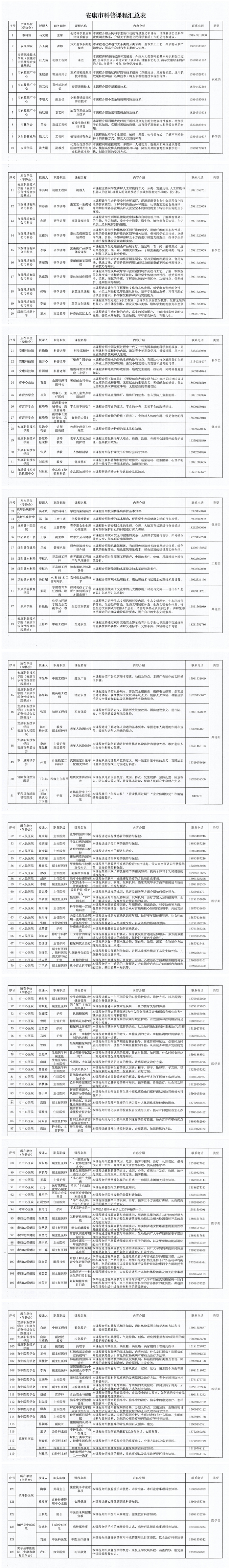 為認(rèn)真落實(shí)《安康市貫徹<全民科學(xué)素質(zhì)行動(dòng)規(guī)劃綱要(2021-2035年)實(shí)施方案》,增強(qiáng)我市科普供給能力,助力提升全民科學(xué)素質(zhì),經(jīng)前期征集、審核整理,形成了安康市科普課程,共計(jì)125門課,內(nèi)容包括但不限于科學(xué)技術(shù)、農(nóng)業(yè)技術(shù)、工程技術(shù)、衛(wèi)生保健、生態(tài)環(huán)保、應(yīng)急處置、運(yùn)動(dòng)健康、生活常識、網(wǎng)絡(luò)安全等科普知識?,F(xiàn)將安康市科普課程予以公布,并就有關(guān)事項(xiàng)通知如下:
