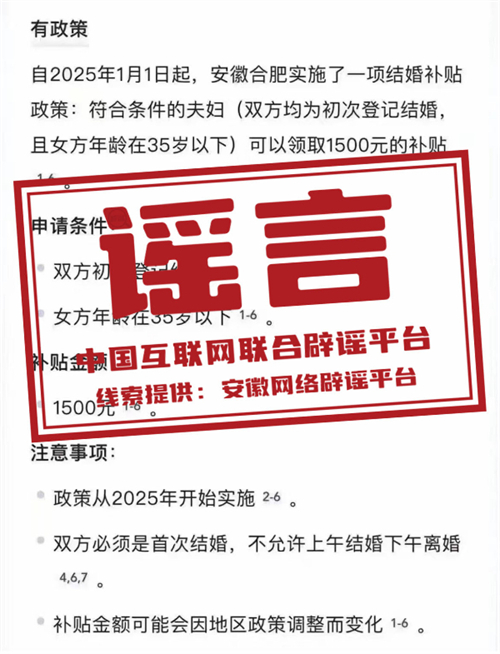 真相:近日,有網(wǎng)民發(fā)布消息稱“自2025年1月1日起,安徽合肥實(shí)施結(jié)婚補(bǔ)貼政策”“初次結(jié)婚登記可以領(lǐng)取1500元補(bǔ)貼”“下載相關(guān)APP即可領(lǐng)補(bǔ)貼款”,引發(fā)關(guān)注。對(duì)此,合肥市民政局發(fā)布聲明稱,網(wǎng)傳消息為謠言。合肥市并未研究、出臺(tái)有關(guān)結(jié)婚登記的補(bǔ)貼政策,望廣大網(wǎng)民注意甄別。(來(lái)源:“安徽省互聯(lián)網(wǎng)違法和不良信息舉報(bào)”微信公眾號(hào))