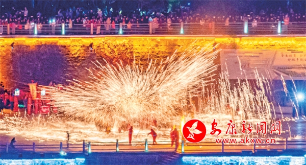 打鐵花點亮漢水之濱。林江 攝