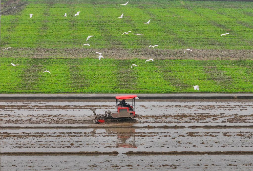 2月25日,在浙江省瑞安市馬嶼鎮(zhèn)儒陽(yáng)村,農(nóng)機(jī)在田間犁地,白鷺低空而飛(無(wú)人機(jī)照片)。早春時(shí)節(jié),各地農(nóng)民搶抓農(nóng)時(shí),開(kāi)展春耕、春管等農(nóng)事活動(dòng),田間地頭到處是一派人勤春早的忙碌景象。 新華社發(fā)(蘇巧將攝)