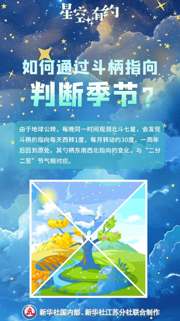 中國科學(xué)院紫金山天文臺科普主管王科超介紹,北斗七星是大熊座的一部分,由七顆明亮的恒星組成勺子形狀,它們是北半球夜空中的標志性星群。七星中,四顆星排列成斗勺,其余三顆星排列成斗柄。由于地球繞日公轉(zhuǎn),每晚同一時間觀測北斗七星,會發(fā)現(xiàn)斗柄的指向每天逆時針向西轉(zhuǎn)1度,每月轉(zhuǎn)動約30度,一周年后回到原處,與季節(jié)輪回基本一致。