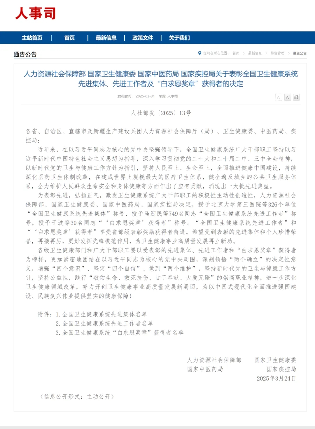 近日,人力資源社會保障部、 國家衛(wèi)生健康委等四部委發(fā)布關(guān)于表彰全國衛(wèi)生健康系統(tǒng)先進(jìn)集體、先進(jìn)工作者及“白求恩獎?wù)隆鲍@得者的決定,我市1個集體、1人分別獲得全國衛(wèi)生健康系統(tǒng)先進(jìn)集體、全國衛(wèi)生健康系統(tǒng)先進(jìn)工作者榮譽(yù)稱號。