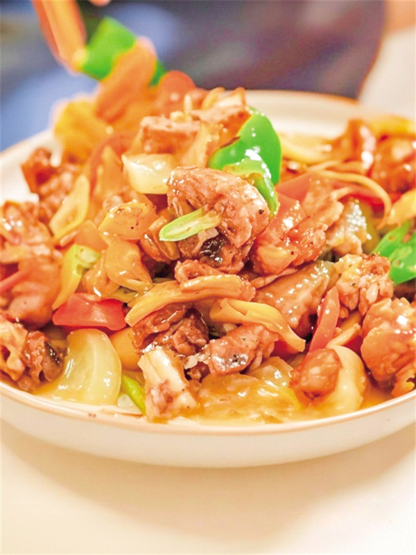 曬干的土豆片用水泡發(fā)喚醒,這看似簡單的步驟暗藏玄機(jī)。浸泡時(shí)間短則發(fā)硬,久則軟爛,唯有經(jīng)驗(yàn)老到的廚娘能把握分寸。“復(fù)活”的土豆片帶著陽光的甘甜與泉水的清冽,在雞肉煸出琥珀色時(shí)傾入鍋中,與郫縣豆瓣醬、蒜頭姜片共舞。當(dāng)褐紅色的醬汁裹滿每塊食材,撒入的野蔥段。炒好裝盤,色澤焦黃的雞肉混合著金黃的土豆片,點(diǎn)綴著翠綠的野蔥段,紅亮的醬汁如絲般纏繞其間,讓人垂涎欲滴。雞肉外皮酥脆而內(nèi)里肉質(zhì)鮮嫩多汁,與土豆片的軟糯完美融合,帶來層次分明的口感享受。辛香與醬香交織,激發(fā)著味蕾的無限遐想,讓人一嘗難忘,也成了安康人飯桌上一道備受歡迎的美食。