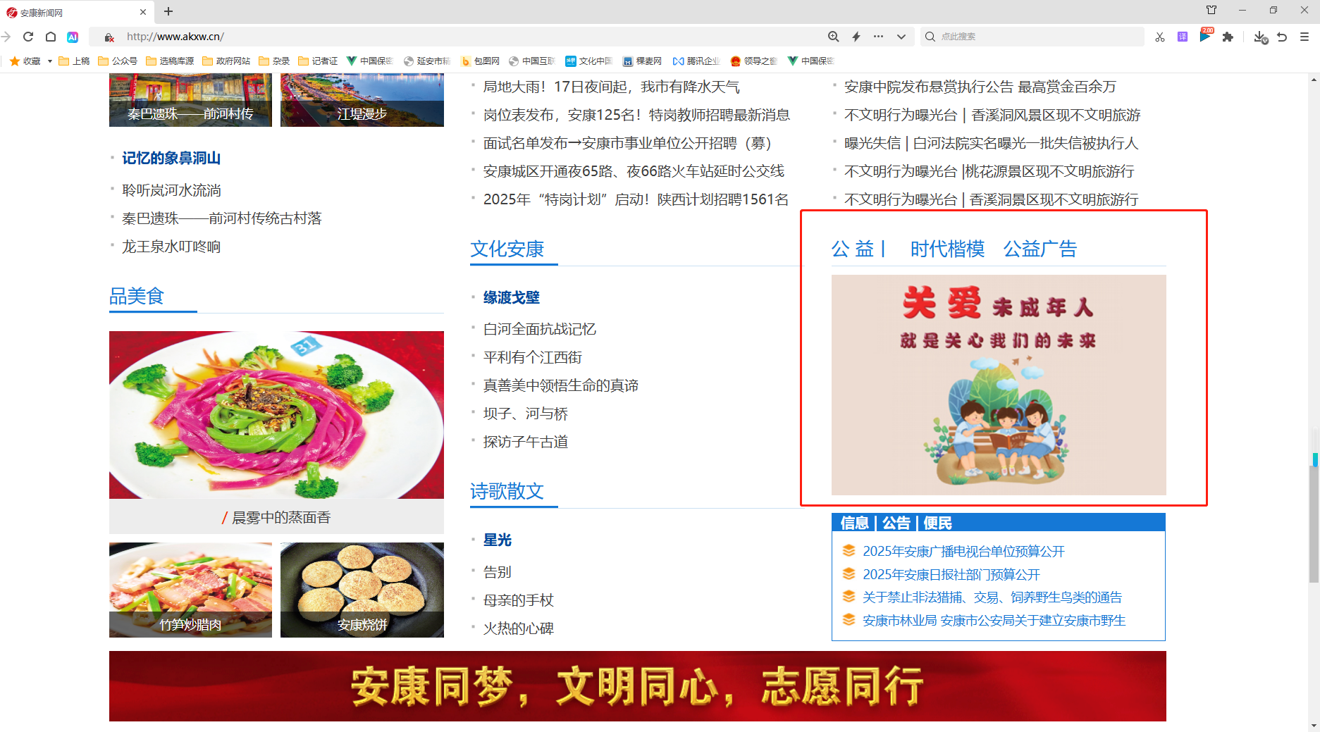 網(wǎng)站首頁設(shè)置“公益”模塊,多頻次發(fā)布時代楷模、公益創(chuàng)文、道德模范等內(nèi)容的公益廣告131條。安康新聞網(wǎng)還積極開展支部“三聯(lián)”共建,助推鄉(xiāng)村振興,廣泛參與到文明創(chuàng)建、交通志愿服務(wù)、義務(wù)植樹、文化下基層等公益活動。