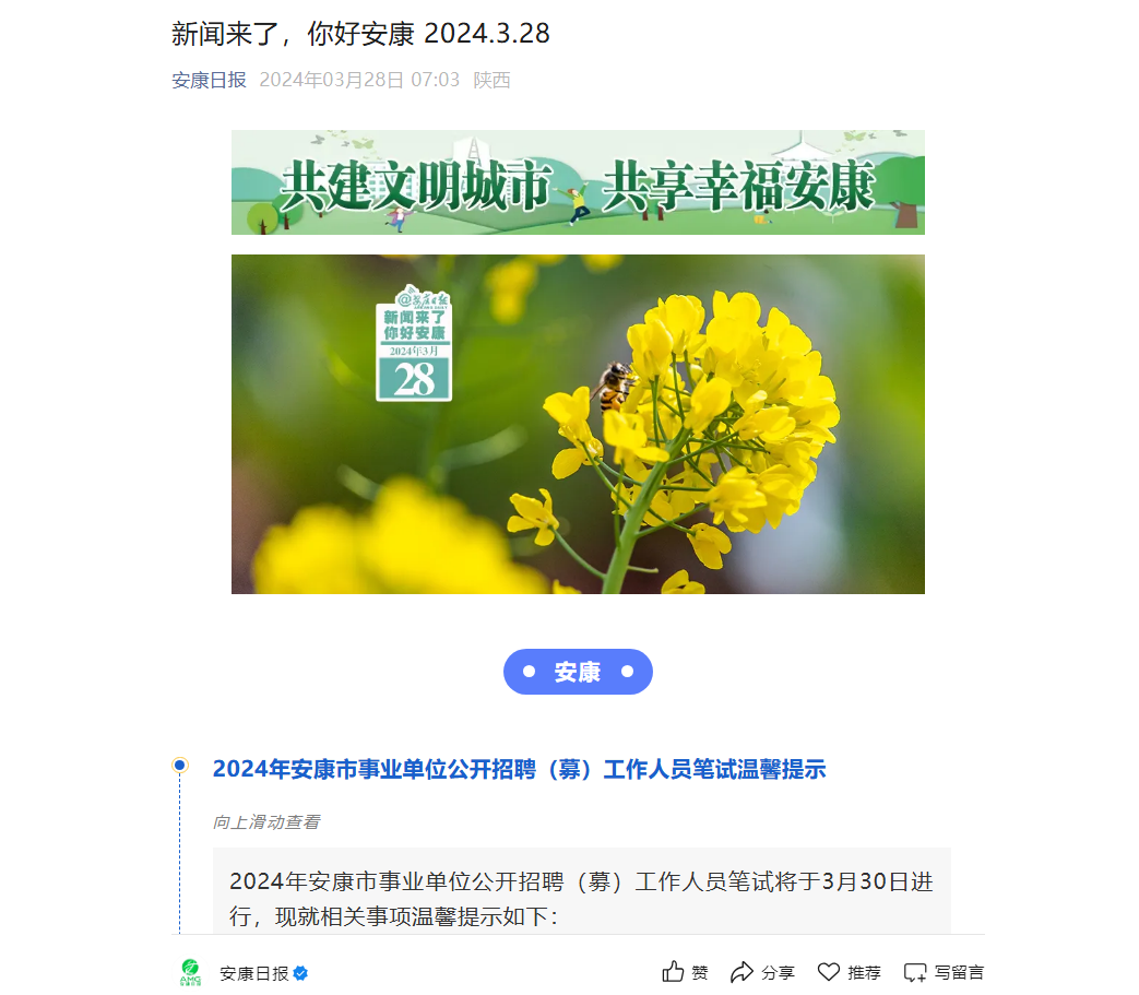 由安康日報社、安康新聞網(wǎng)運維的“安康發(fā)布”微信公眾平臺圍繞“聚焦重點政務(wù)新聞推送、深化政務(wù)公開、做好政策宣傳,助推政務(wù)服務(wù)”,著力打造政策宣傳、權(quán)威可信的內(nèi)容體系,整體傳播影響力、服務(wù)水平和引導(dǎo)能力不斷提升。累計推送推文900余期,推文1400余條,總閱讀次數(shù)95.8萬次。堅持民生視角,做強“服務(wù)力”,走好“網(wǎng)上群眾路線”,不斷深化完善“政務(wù)+服務(wù)”理念,圍繞就業(yè)就學(xué)、交通出行、重要天氣預(yù)報等民生消息,科學(xué)全面細致做好內(nèi)容發(fā)布。