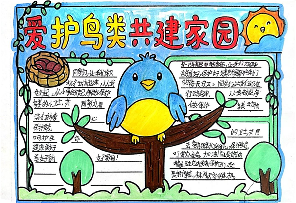 守護(hù)藍(lán)天精靈,共享美好家園!《安康高新區(qū)愛鳥護(hù)鳥倡議書》發(fā)布以來,全區(qū)的孩子們積極行動(dòng),他們用畫筆以純真之心勾勒出對(duì)鳥兒的關(guān)愛與守護(hù)。他們把對(duì)鳥兒的喜愛融進(jìn)顏料,將守護(hù)的心愿畫入畫紙。稚嫩的筆觸下,有給小鳥搭建的溫暖巢穴,有禁止捕鳥的醒目標(biāo)語,有鳥兒在藍(lán)天自由翱翔的愜意,有人類與鳥兒和諧共處的溫馨,有孩子們與鳥兒牽手同行的幻想…… (通訊員 劉松)