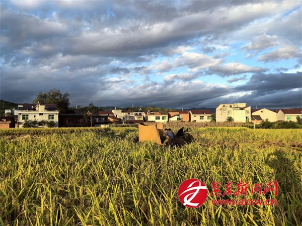 走進新河村,陽光灑在沉甸甸的稻穗上,飽滿的谷粒泛著金黃光澤。微風拂過,連片稻田掀起層層稻浪,裹挾著清新的谷物香氣彌漫田間。稻田里,農機手熟練地操控著收割機,在田間來回穿梭,機身所過之處,水稻快速完成脫粒、秸稈分離,金黃的稻谷源源不斷送入機倉,實現(xiàn)顆粒歸倉;為進一步加快水稻收割進度,幾位村民則支起拌桶,手持稻把用力拍打,沿用傳統(tǒng)打谷技藝同步搶收,機器轟鳴聲、打谷聲與村民的歡聲笑語交織成秋日豐收的“協(xié)奏曲”。