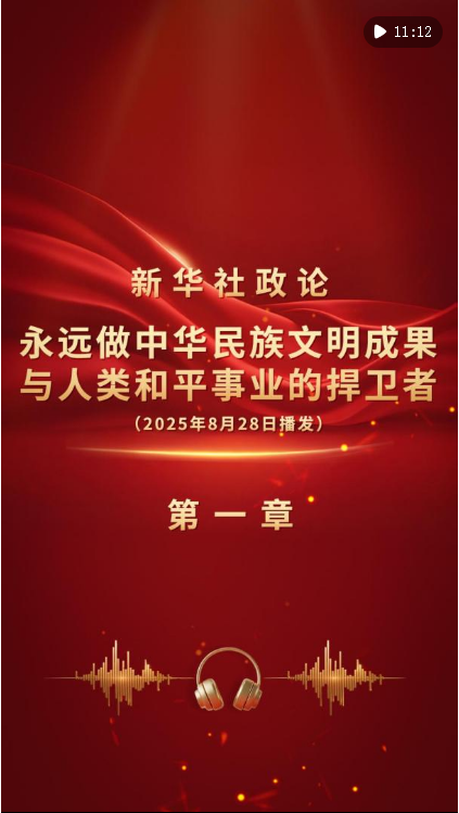 新華社8月28日播發(fā)《新華社政論|永遠(yuǎn)做中華民族文明成果與人類和平事業(yè)的捍衛(wèi)者——寫在中國(guó)人民抗日戰(zhàn)爭(zhēng)暨世界反法西斯戰(zhàn)爭(zhēng)勝利80周年之際》。我們邀請(qǐng)誦讀嘉賓任志宏演播“第一章”。