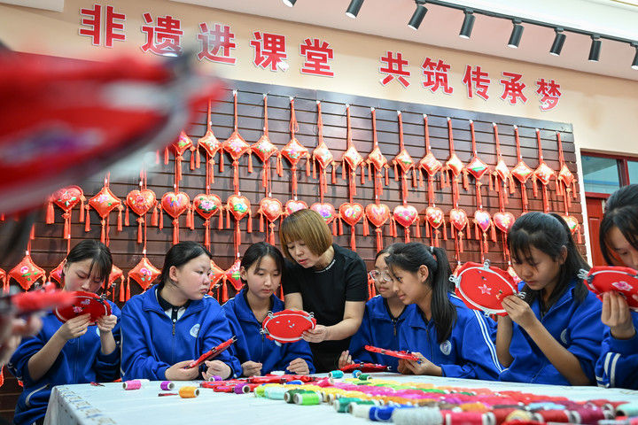 2025年9月26日,內(nèi)蒙古興安盟科右中旗巴彥呼舒第六中學美術(shù)教師、非遺代表性傳承人吳斯琴(左四)指導學生刺繡。近年來,內(nèi)蒙古興安盟科爾沁右翼中旗巴彥呼舒第六中學將當?shù)貒壹壏沁z圖什業(yè)圖刺繡引入校園,開設校本課程,并成立興趣社團,在豐富校園文化生活的同時,讓學生們近距離感受非遺的魅力,弘揚和傳承中華優(yōu)秀傳統(tǒng)文化。