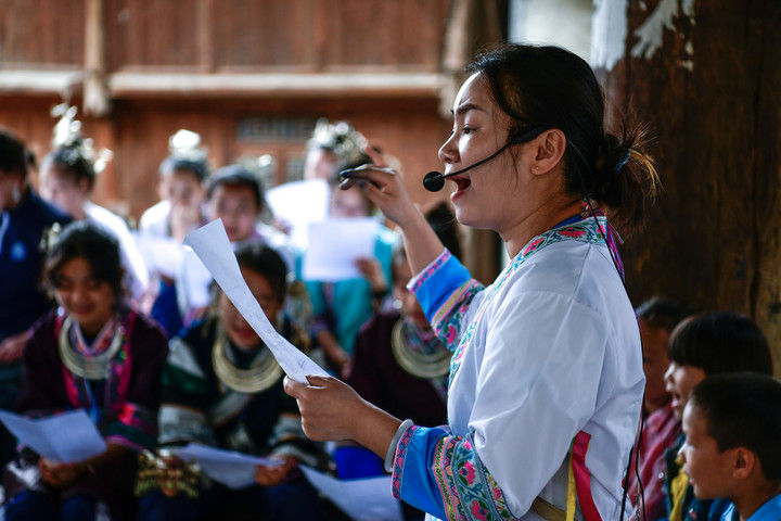 隨著國產(chǎn)動畫電影《哪吒之魔童鬧?!凡粩嗨⑿轮袊笆菲狈考o錄,參與電影配樂的貴州省榕江縣三寶侗寨的楊想妮和“舞樂蟬歌”團隊為更多人所熟知。樂團成員懷揣“用音樂傳遞侗族文化,讓世界聽見侗族大歌”的共同夢想,將侗族大歌推向更廣闊的舞臺。這是2025年4月22日,楊想妮在貴州省黎平縣肇興鎮(zhèn)廈格侗寨教前來研學的孩子們唱侗歌。