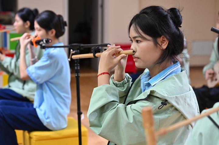 2025年6月12日,海南省民族技工學校學生在練習黎族鼻簫。近年來,海南省五指山市打造“非遺進校園”工程,在14所公辦中小學開設非遺課程,培養(yǎng)青少年對中華優(yōu)秀傳統(tǒng)文化的熱愛,助力非遺傳承與發(fā)展。