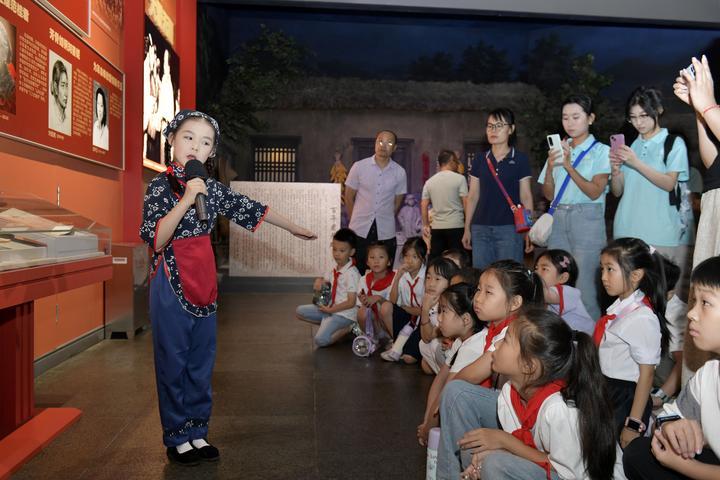 2025年8月7日,在山東省臨沂市沂蒙革命紀念館,沂蒙紅孩子文藝先鋒隊的房沫昕在講述紅色故事《沂蒙紅嫂祖秀蓮》。2024年9月,位于沂蒙革命老區(qū)的山東省臨沂市以“傳承沂蒙精神”為宗旨組建沂蒙紅孩子文藝先鋒隊,通過歌舞、朗誦、故事講述、舞臺劇等紅色主題文藝節(jié)目,增強紅色文化感染力,不斷為紅色基因代代相傳注入新生力量。