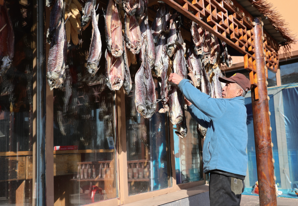 ??2025年11月22日,查干湖畔一家農(nóng)家樂(lè)的老板在曬魚干。從整條鮮魚到分割魚,從線下到線上,查干湖的“魚產(chǎn)業(yè)”年年攀新高,2023年、2024年銷售額均在5000萬(wàn)元以上。