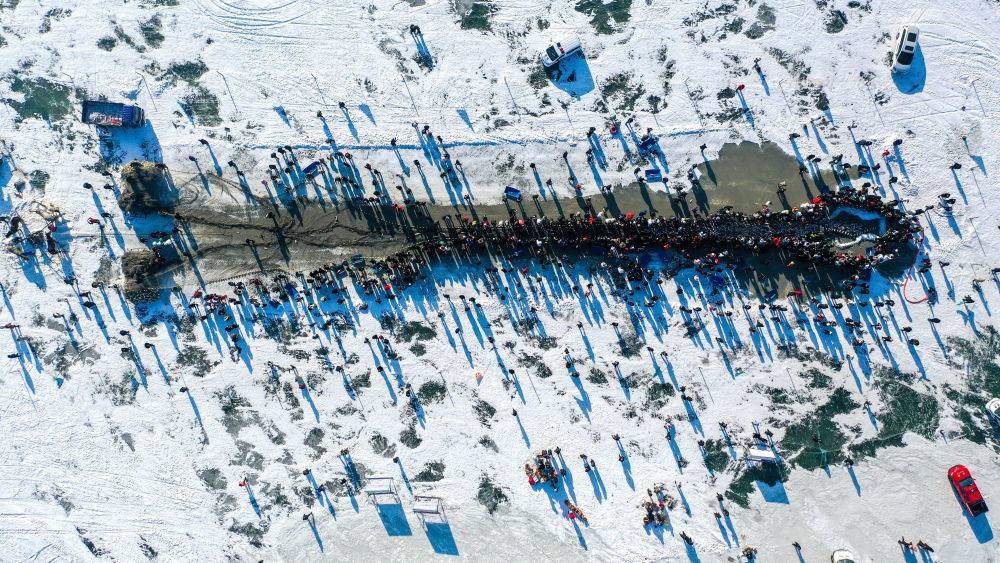 ??2021年12月26日,游客在查干湖冰面上觀看冬捕。近年來(lái),查干湖在保護(hù)生態(tài)環(huán)境的基礎(chǔ)上,推動(dòng)冬捕的可持續(xù)發(fā)展,通過(guò)科學(xué)規(guī)劃捕撈量、加強(qiáng)漁業(yè)資源管理等措施,確保查干湖漁業(yè)資源的穩(wěn)定增長(zhǎng)。