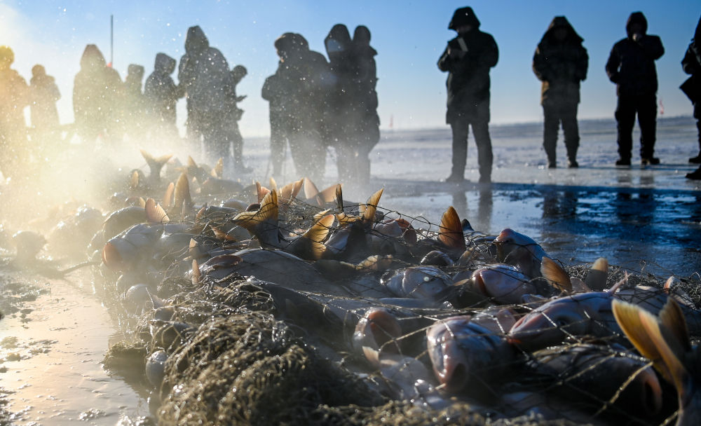 ??2026年1月7日,漁民們將漁網(wǎng)拖出查干湖冰面。