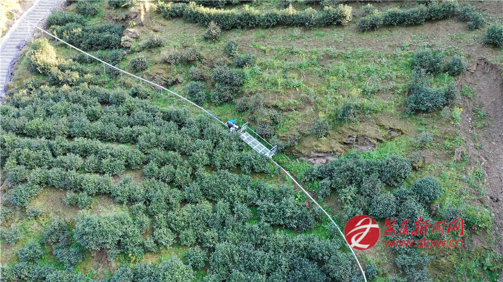 (圖為蘇陜項目支持建設(shè)的煥古鎮(zhèn)大連村軌道車上山運輸鮮葉)