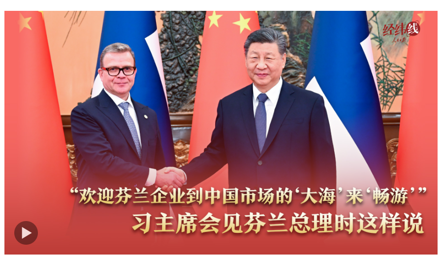 “歡迎芬蘭企業(yè)到中國(guó)市場(chǎng)的‘大海’來(lái)‘暢游’,提升全球競(jìng)爭(zhēng)力?!?月27日,習(xí)近平主席會(huì)見芬蘭總理奧爾波時(shí)強(qiáng)調(diào)。展望未來(lái),中方愿同芬方增進(jìn)互信、加強(qiáng)交流、深化合作,助力各自國(guó)家發(fā)展,為兩國(guó)人民帶來(lái)更多福祉。