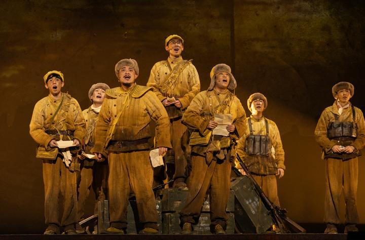 這是音樂劇《尋找李二狗》的演出劇照(2025年4月7日攝)。該劇以抗美援朝偉大歷史為背景,取材自志愿軍第39軍116師真實(shí)故事,通過當(dāng)代青年常衛(wèi)國借助爺爺?shù)幕貞涗洿┰交?950年鴨綠江畔的舞臺(tái)設(shè)定,展開兩代青年的跨時(shí)空對(duì)話。2025年11月,該劇榮獲第十八屆文華劇目獎(jiǎng)。
