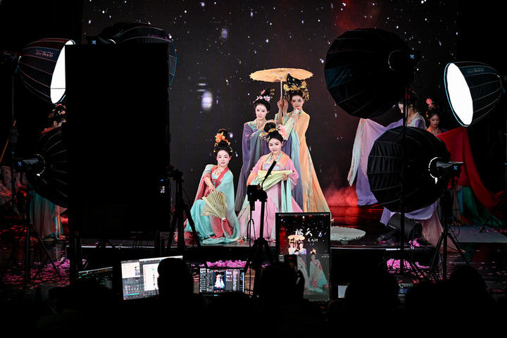 陜西省歌舞劇院的舞蹈演員在直播間進(jìn)行“團(tuán)播”表演(2025年12月25日攝)?!皥F(tuán)播”這一多人演藝直播新形式,正成為專業(yè)文藝院團(tuán)開辟線上“第二舞臺(tái)”、推動(dòng)傳統(tǒng)文化創(chuàng)新表達(dá)的新嘗試?!柏Q屏化”“快節(jié)奏”的改編,讓傳統(tǒng)劇目受到越來越多年輕人喜愛。數(shù)據(jù)顯示,陜西省歌舞劇院“團(tuán)播”單場(chǎng)最高曝光量超500萬,帶動(dòng)線下票房增長約10%。