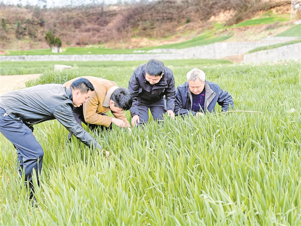 “這塊墑情不錯,但那邊靠坡的地有點干,施肥得區(qū)別對待。”2月24日,漢濱區(qū)農業(yè)農村局聯合相關部門組建技術服務隊,分赴各糧食生產重點鎮(zhèn)。汪德義帶著隊員們逐塊田排查,建立管理臺賬,針對不同苗情、墑情精準開具“個性化處方”。農戶圍在他身邊,聽得認真,問得仔細。