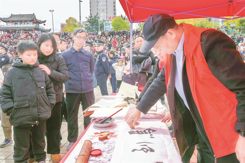 市集不僅有宣傳與服務(wù),更有可看可學(xué)的文明實踐。活動通過宣傳展板集中展示漢濱區(qū)移風(fēng)易俗成果與文明新風(fēng)先進典型事跡,用身邊人、身邊事帶動群眾。非遺代表性傳承人現(xiàn)場詮釋勤儉美德,書法愛好者現(xiàn)場書寫福字與家訓(xùn),讓群眾在傳統(tǒng)文化熏陶中,潛移默化地接受新風(fēng)教育?!胺沁z、書法和移風(fēng)易俗結(jié)合得好,孩子也能受教育。”帶著孩子逛市集的市民李女士收獲滿滿、笑意盈盈。