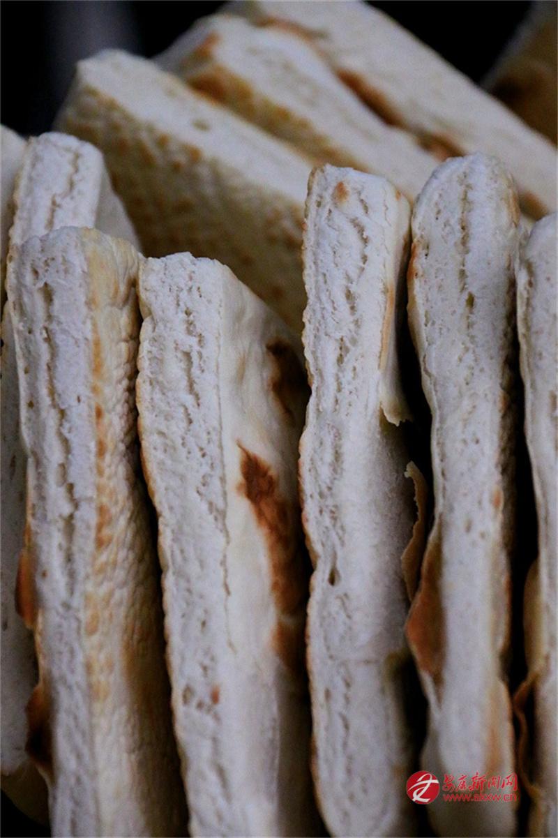 安康的牙牙兒饃是發(fā)面的。發(fā)面,在北方多用于蒸饅頭、包子,用來打饃且泡在湯里吃的,似乎不多見。安康人卻偏偏這么做了。面粉加了酵母,醒得恰到好處,不能太酸,也不能太生,揉成團(tuán),搟成圓,在鏊子上烙?;鸷蛞m中,兩面烙得焦黃,帶著些許褐色的斑點(diǎn),像是虎背上的花紋,雖不如西安饦饦饃那般白凈,卻多了一股子麥香和火氣。