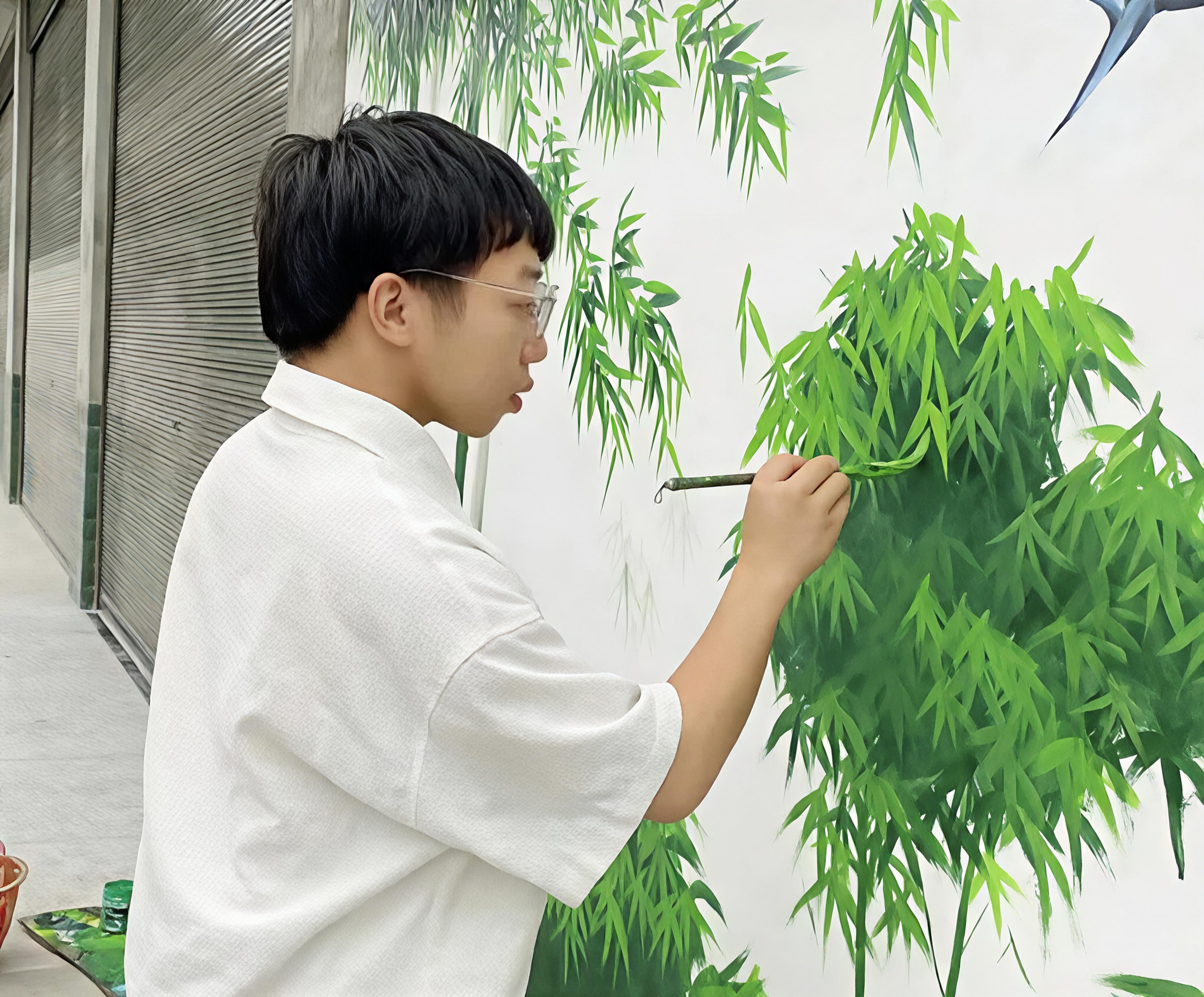 張家壩村,1998年出生的游乙山正蹲在墻角專注創(chuàng)作,不多時(shí),一面栩栩如生的文化墻便呈現(xiàn)眼前,與青山綠水、整潔街道相映成趣,勾勒出鄉(xiāng)村振興的美好畫卷。這位土生土長(zhǎng)的正陽(yáng)青年,畢業(yè)于湖南文理學(xué)院,憑借扎實(shí)繪畫功底,在鄰縣創(chuàng)辦“藝山美學(xué)館”,從事美術(shù)培訓(xùn)和墻體彩繪。