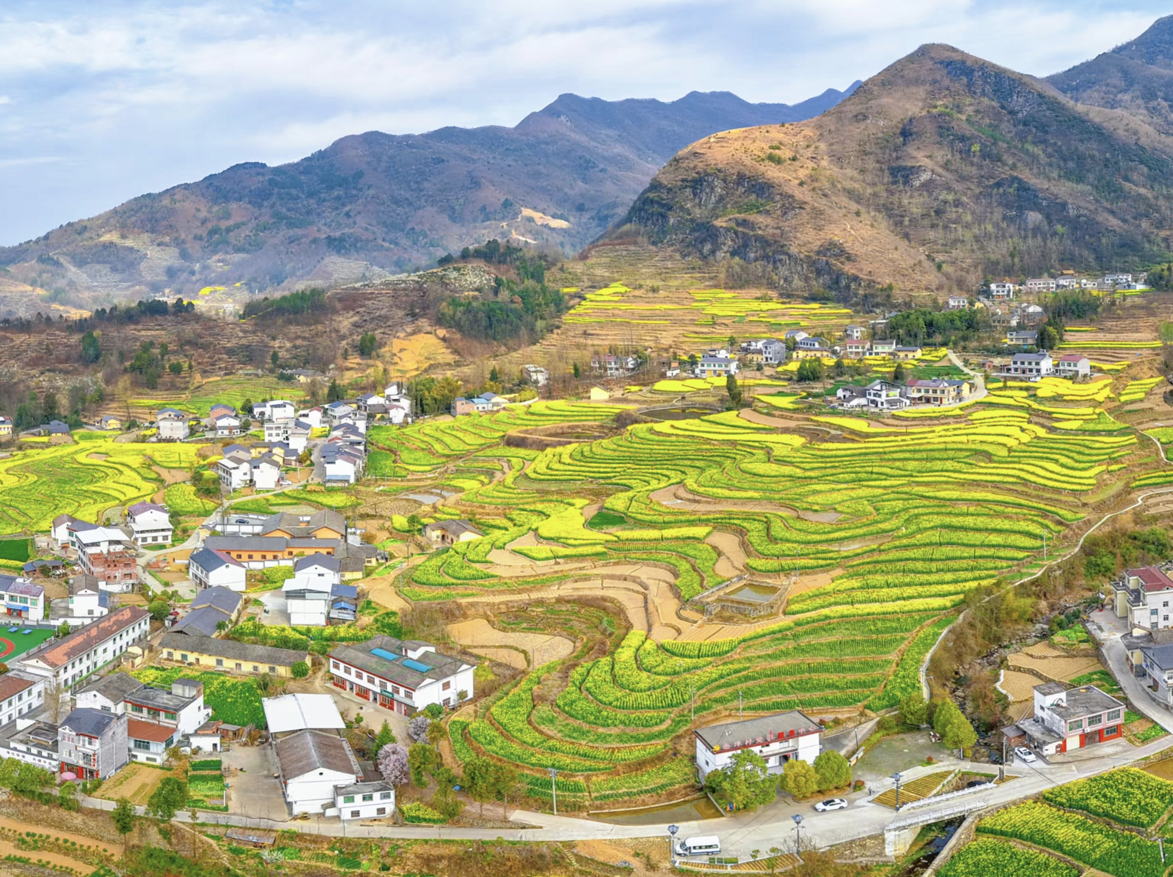 春風(fēng)拂過秦巴山區(qū),漢陰縣城關(guān)鎮(zhèn)的櫻花如霞似錦、李花如雪紛飛,鋪開一片浪漫的花海,澗池鎮(zhèn)和蒲溪鎮(zhèn)的桃花將山坡染成緋紅色。向南而去,漩渦鎮(zhèn)的鳳堰梯田上,金色的油菜花順著山勢層層疊疊,如潮水般涌向天際。