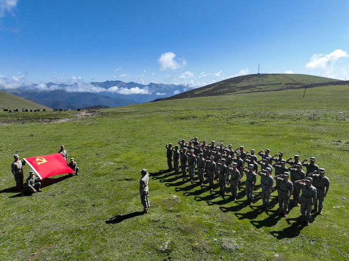 西部戰(zhàn)區(qū)空軍某團遠程機動訓練途中組織官兵舉行重溫入黨誓詞活動(2025年6月30日攝,無人機照片)。新華社發(fā)(鄧世寧 攝)