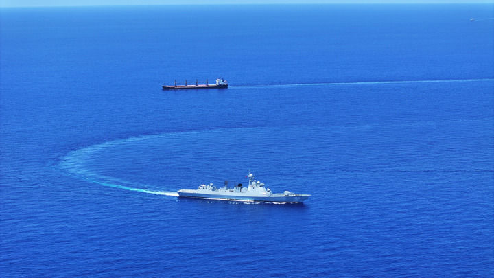中國海軍第46批護航編隊焦作艦(下)護送貨船至解護點后與之分航(2024年5月7日攝)。新華社發(fā)(張大禹 攝)