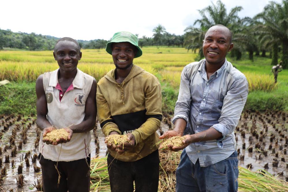 3月25日,在布隆迪布瓊布拉省姆潘達(dá)縣,當(dāng)?shù)剞r(nóng)業(yè)技術(shù)員麥樂斯(右)與附近農(nóng)戶們手捧剛剛收獲的稻粒。新華社記者 鞠銀河 攝