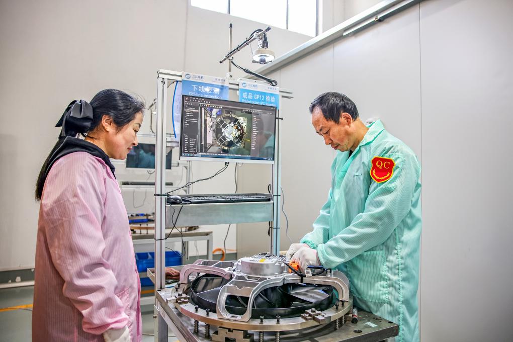 2026年4月2日,三江電器的工人正對電機(jī)產(chǎn)品進(jìn)行下線檢查。(受訪者供圖)