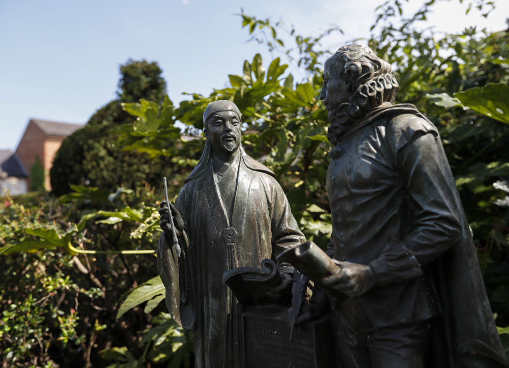 2022年4月20日在英國斯特拉特福拍攝的莎士比亞和湯顯祖的青銅塑像。新華社記者 韓巖 攝