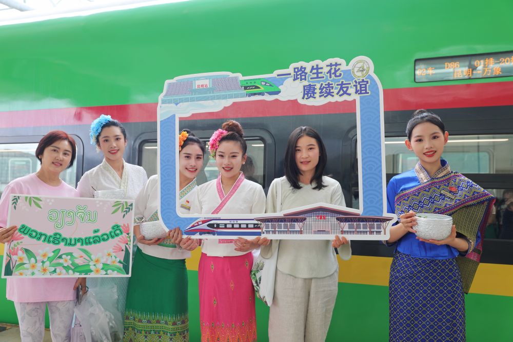 2025年7月18日,在昆明站,乘坐昆明至萬象D86次列車的乘客與乘務(wù)員合影。新華社發(fā)(楊紫軒攝)