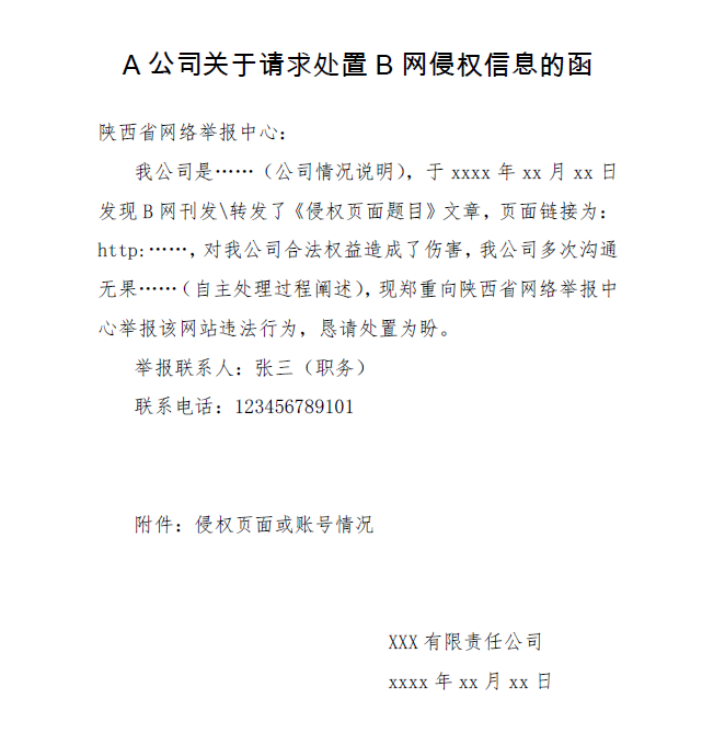標(biāo)題二號(hào)宋體居中,與正文空一格,正文三號(hào)仿宋,需闡述清楚舉報(bào)人\單位情況,舉報(bào)事由,自主處理過程,舉報(bào)訴求,聯(lián)系人及聯(lián)系方式,落款加蓋單位公章或本人簽字。格式為PDF件(如無法提供,可拍攝高清照片發(fā)送原圖)或直接傳真至029-63907152。