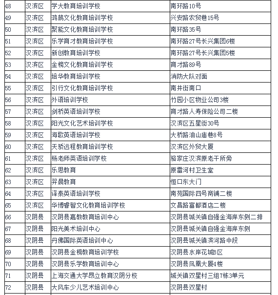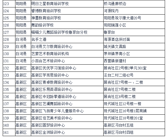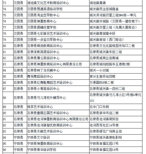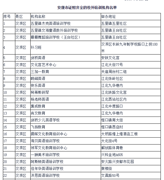 為進(jìn)一步規(guī)范我市校外培訓(xùn)機(jī)構(gòu)辦學(xué)行為,有效遏制當(dāng)前存在的中小學(xué)生課外負(fù)擔(dān)不斷加重的突出問題,保障中小學(xué)生健康成長(zhǎng),各縣區(qū)按照安康市教育局、公安局、民政局、人力資源和社會(huì)保障局、工商行政管理局聯(lián)合印發(fā)的《關(guān)于切實(shí)減輕中小學(xué)生課外負(fù)擔(dān)開展校外培訓(xùn)機(jī)構(gòu)專項(xiàng)治理行動(dòng)的通知》(安教發(fā)〔2018〕33號(hào))和全市校外培訓(xùn)機(jī)構(gòu)專項(xiàng)治理行動(dòng)推進(jìn)會(huì)要求,由教育行政部門牽頭,會(huì)同公安、民政、人社、市場(chǎng)監(jiān)管等部門和鎮(zhèn)街聯(lián)合執(zhí)法,開展了摸底排查工作。截止5月底,全市共排查民辦非學(xué)歷文化教育培訓(xùn)機(jī)構(gòu)540家,其中具有辦學(xué)資質(zhì)的培訓(xùn)機(jī)構(gòu)141家,無辦學(xué)許可證的培訓(xùn)機(jī)構(gòu)399家。現(xiàn)將具有辦學(xué)資質(zhì)的校外培訓(xùn)機(jī)構(gòu)名單和無辦學(xué)許可證的校外培訓(xùn)機(jī)構(gòu)名單予以公布。請(qǐng)有需求的學(xué)生和家長(zhǎng)務(wù)必選擇具有辦學(xué)資質(zhì)的校外培訓(xùn)機(jī)構(gòu)參加培訓(xùn)。為保障中小學(xué)生健康成長(zhǎng)和廣大受教育者合法權(quán)益,禁止學(xué)生到無辦學(xué)許可證的校外培訓(xùn)機(jī)構(gòu)參加培訓(xùn)。