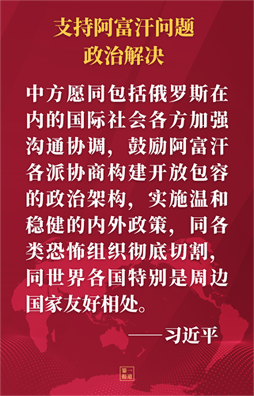 習近平強調(diào),中方尊重阿富汗的主權(quán)、獨立、領(lǐng)土完整,奉行不干涉阿內(nèi)政的政策,一直為政治解決阿富汗問題發(fā)揮建設(shè)性作用。中方愿同包括俄羅斯在內(nèi)的國際社會各方加強溝通協(xié)調(diào),鼓勵阿富汗各派協(xié)商構(gòu)建開放包容的政治架構(gòu),實施溫和穩(wěn)健的內(nèi)外政策,同各類恐怖組織徹底切割,同世界各國特別是周邊國家友好相處。