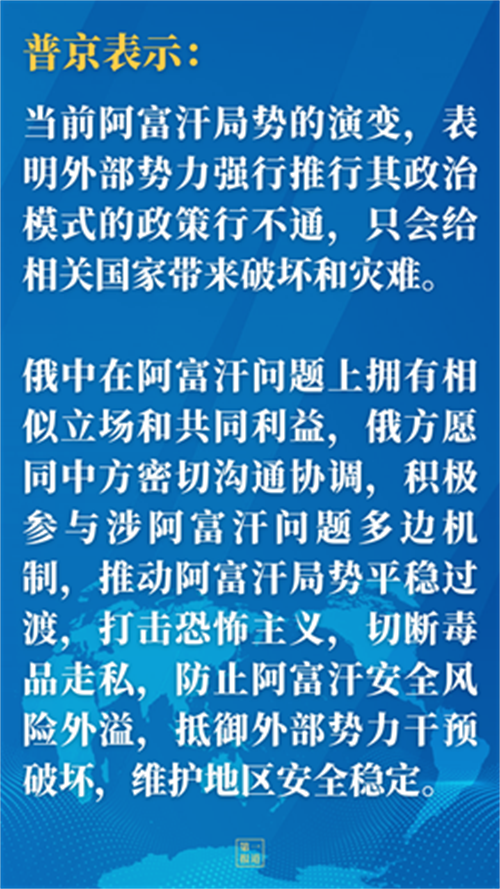 普京表示,當前阿富汗局勢的演變,表明外部勢力強行推行其政治模式的政策行不通,只會給相關(guān)國家?guī)砥茐暮蜑?zāi)難。俄中在阿富汗問題上擁有相似立場和共同利益,俄方愿同中方密切溝通協(xié)調(diào),積極參與涉阿富汗問題多邊機制,推動阿富汗局勢平穩(wěn)過渡,打擊恐怖主義,切斷毒品走私,防止阿富汗安全風險外溢,抵御外部勢力干預(yù)破壞,維護地區(qū)安全穩(wěn)定。