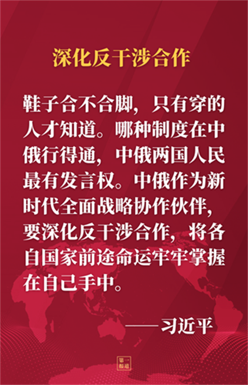 習近平強調(diào),鞋子合不合腳,只有穿的人才知道。哪種制度在中俄行得通,中俄兩國人民最有發(fā)言權(quán)。中俄作為新時代全面戰(zhàn)略協(xié)作伙伴,要深化反干涉合作,將各自國家前途命運牢牢掌握在自己手中。中方堅定支持俄羅斯走符合本國國情的發(fā)展道路,堅定支持俄方為維護國家主權(quán)安全所采取的舉措。雙方要以今年上海合作組織成立20周年為契機,同成員國一道,加強團結(jié)協(xié)作,加大相互支持,維護地區(qū)國家安全和發(fā)展利益。