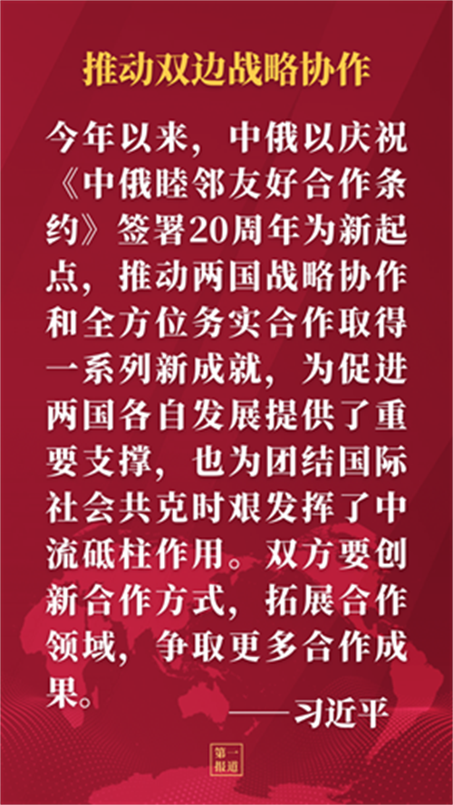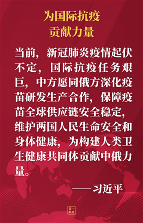 習近平指出,今年以來,中俄以慶!吨卸砟类徲押煤献鳁l約》簽署20周年為新起點,推動兩國戰(zhàn)略協(xié)作和全方位務(wù)實合作取得一系列新成就,為促進兩國各自發(fā)展提供了重要支撐,也為團結(jié)國際社會共克時艱發(fā)揮了中流砥柱作用。雙方要創(chuàng)新合作方式,拓展合作領(lǐng)域,爭取更多合作成果。當前,新冠肺炎疫情起伏不定,國際抗疫任務(wù)艱巨,中方愿同俄方深化疫苗研發(fā)生產(chǎn)合作,保障疫苗全球供應(yīng)鏈安全穩(wěn)定,維護兩國人民生命安全和身體健康,為構(gòu)建人類衛(wèi)生健康共同體貢獻中俄力量。