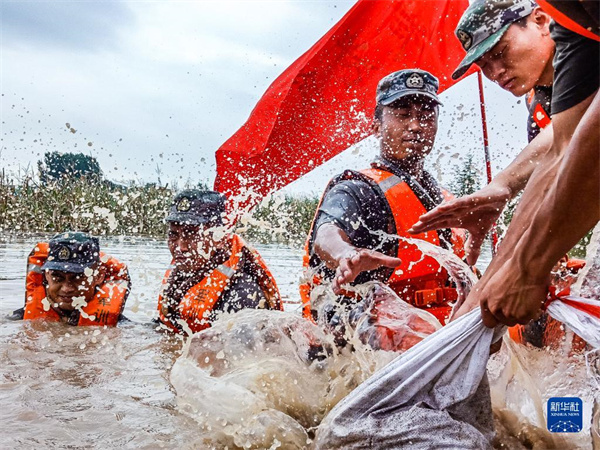 湖北石首久合垸鄉(xiāng)團(tuán)山河支堤出現(xiàn)“管涌”險(xiǎn)情,解放軍官兵立即奔赴險(xiǎn)段,以血肉之軀擋住肆虐的洪水,減低洪水的沖擊力,同時(shí)加固堤防(1998年8月11日攝)。新華社發(fā)(資料照片)