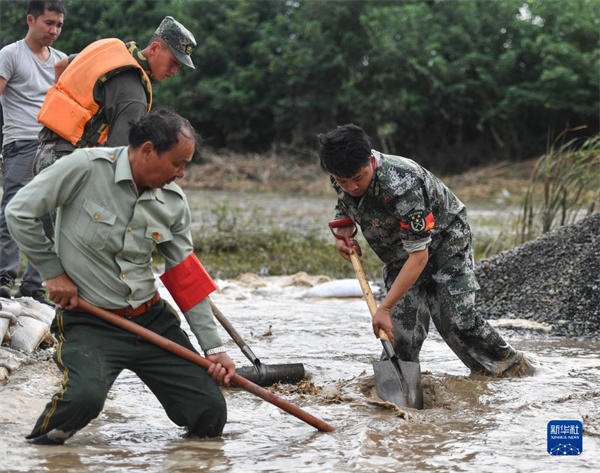 在江西省鄱陽(yáng)縣鄱陽(yáng)鎮(zhèn)江家?guī)X村,由平均年齡超過(guò)五十歲的阿姨們組成的抗洪“阿姨團(tuán)”給武警戰(zhàn)士送來(lái)綠豆湯(2020年7月11日攝)。新華社記者 周密 攝
