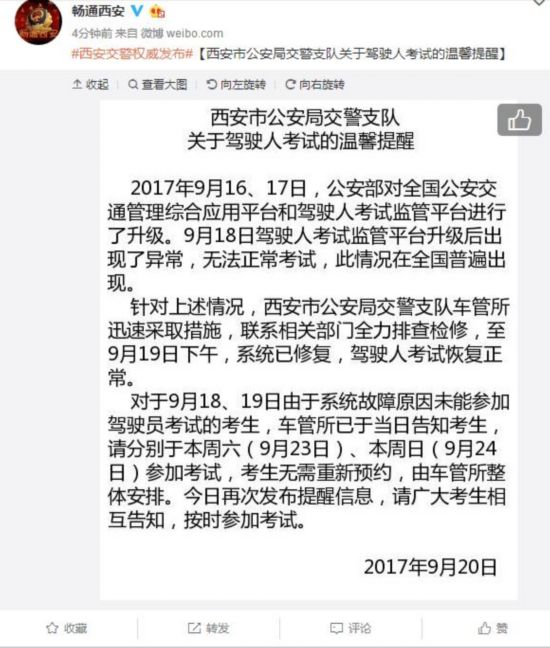 西安市交警支隊(duì)表示,因2017年9月16、17日,公安部對(duì)全國(guó)公安交通管理綜合應(yīng)用平臺(tái)和駕駛?cè)丝荚嚤O(jiān)管平臺(tái)進(jìn)行了升級(jí)。9月18日駕駛?cè)丝荚嚤O(jiān)管平臺(tái)出現(xiàn)了異常,無(wú)法正常考試,此情況在全國(guó)普遍出現(xiàn)。