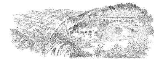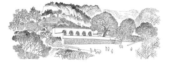 陜北革命舊址寫生,面對復(fù)雜的景物,須瞬間分析,即刻做出判斷、選擇、取舍、構(gòu)圖,抓住整體、突出特點(diǎn),果斷下筆。以線寫生,務(wù)求準(zhǔn)確,落筆后,線不可重復(fù),也無法修改。寫生時,常常左手打傘,天熱時遮陽光,每當(dāng)大汗淋漓,也顧不上擦;下雨時,盡量用傘遮住畫紙,堅持畫完,即便衣服濕透也無所謂。如果對寫生作品不滿意時,就重新赴舊址寫生,僅涇陽縣云陽革命舊址,他就去過4次,清澗縣石嘴驛去了3次,直到畫好為止。