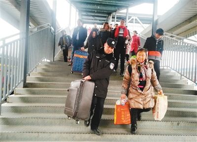 民警幫助旅客拎包,將其送至站臺(tái)。記者張松 通訊員楊長(zhǎng)空 郝黎俊 攝