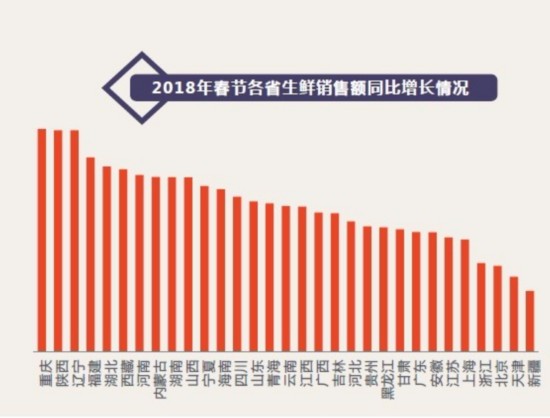 與2017年春節(jié)期間相比,2018年春節(jié)生鮮消費(fèi)同比增長(zhǎng)最快的省份包括重慶、陜西、遼寧、福建、湖北,其銷售額同比增長(zhǎng)均超過300%。(李程)