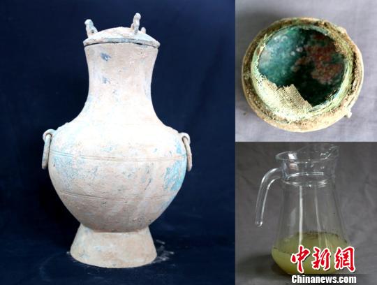 據(jù)介紹,此次出土銅壺的口部以條狀物覆扎有粗布,密封性極好,因此得以保留總量約300毫升的近乳白色透明液體。檢測后發(fā)現(xiàn),液體中含有較高的羥脯氨酸、谷氨酸等氨基酸以及少量任二酸、月桂酸等脂肪酸等物質(zhì)。其中,羥脯氨酸、谷氨酸等氨基酸的含量分別為4.83ug/g和2.40ug/g,屬于酒類物質(zhì)。