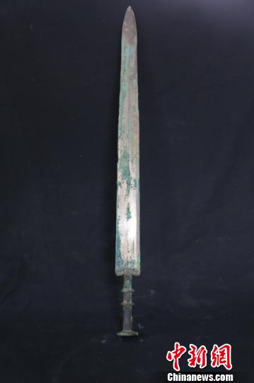 考古人員在一座秦人墓葬中發(fā)掘出土了保存完整的銅劍一柄,通長60厘米。屬于傳統(tǒng)的“周式”長劍,一體連鑄,束腰及八面體的劍身有很強的殺傷力。