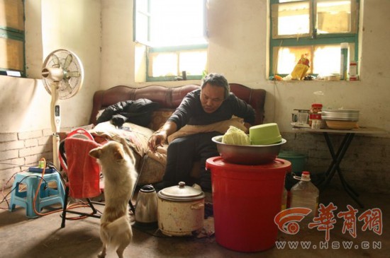 3月26日上午華商報記者趕到時,房前有幾戶居民正在洗衣服閑聊,在居民的指引下,華商報記者打開桑福漢緊閉的家門,家中兩個房間昏暗潮濕,47歲的他頭發(fā)斑白,在里屋靠窗位置沙發(fā)上坐著,面前就是鍋碗瓢盆、電飯煲、電熱水器等。看到陌生人進來,一條小狗一陣亂叫。